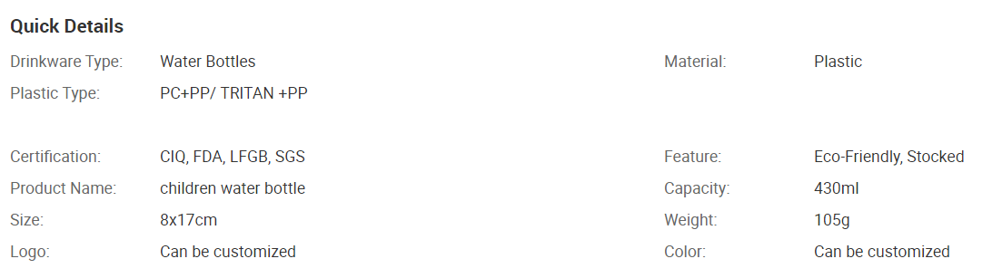 Food grade plastic 430ml child kids baby training sippy cup drink water bottle